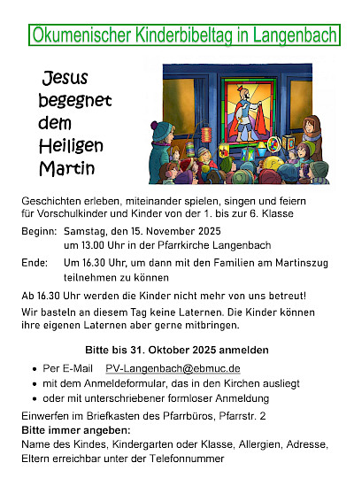 Herzliche Einladung zum Geschichten erleben, miteinander spielen, singen und feiern für Vorschulkinder und Kinder von der 1. bis zur 6. Klasse am Samstag, den 15. November 2025 von 13:00 bis 16:30 Uhr in der Pfarrkirche Langenbach. Danach können alle mit ihren Familien am Langenbacher Martinszug teilnehmen. Die Kinder können gerne dafür schon ihre Laternen mitbringen. (ab 16.30 Uhr werden die Kinder nicht mehr betreut)