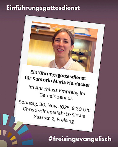 Im Gottesdienst am ersten Advent, 30. November um 9:30 Uhr, wird Maria Heidecker in der Christi-Himmelfahrts-Kirche feierlich in ihren Dienst eingeführt. Dieser Gottesdienst wird musikalisch ganz besonders gestaltet sein. Lassen Sie sich überraschen!