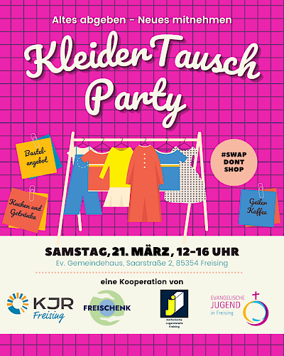 Am Samstag, den 21. März 2026, findet von 12 bis 16 Uhr im Evangelischen Gemeindehaus, Saarstr. 2, (Eingang über den Glasgang) 85354 Freising eine Kleidertauschparty statt. Der Eintritt ist frei.