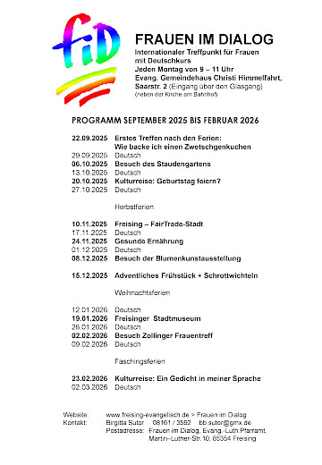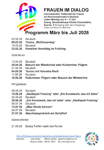 Wir treffen uns im Evangelischen Gemeindehaus Christi Himmelfahrt, Eingang Saarstr. 2 (neben der Kirche beim Bahnhof), 85354 Freising.