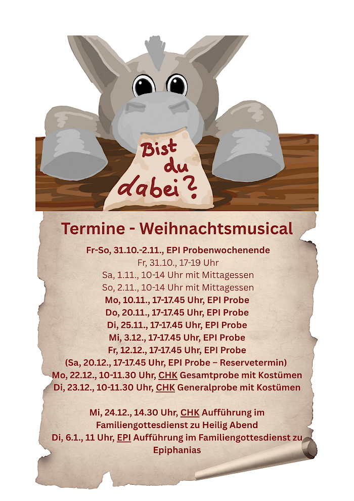 An Heilig Abend wird es dieses Jahr ein selbstgeschriebenes Weihnachtsmusical geben. Unsere EPI-Chorleitung Christina Dreesbach ist schon fleißig am Komponieren. Alles dreht sich rund um den treuen aber auch ein bisschen tollpatschigen Esel, der Maria und Josef nach Bethlehem begleitet. "Ein Esel für's Leben" eben.
